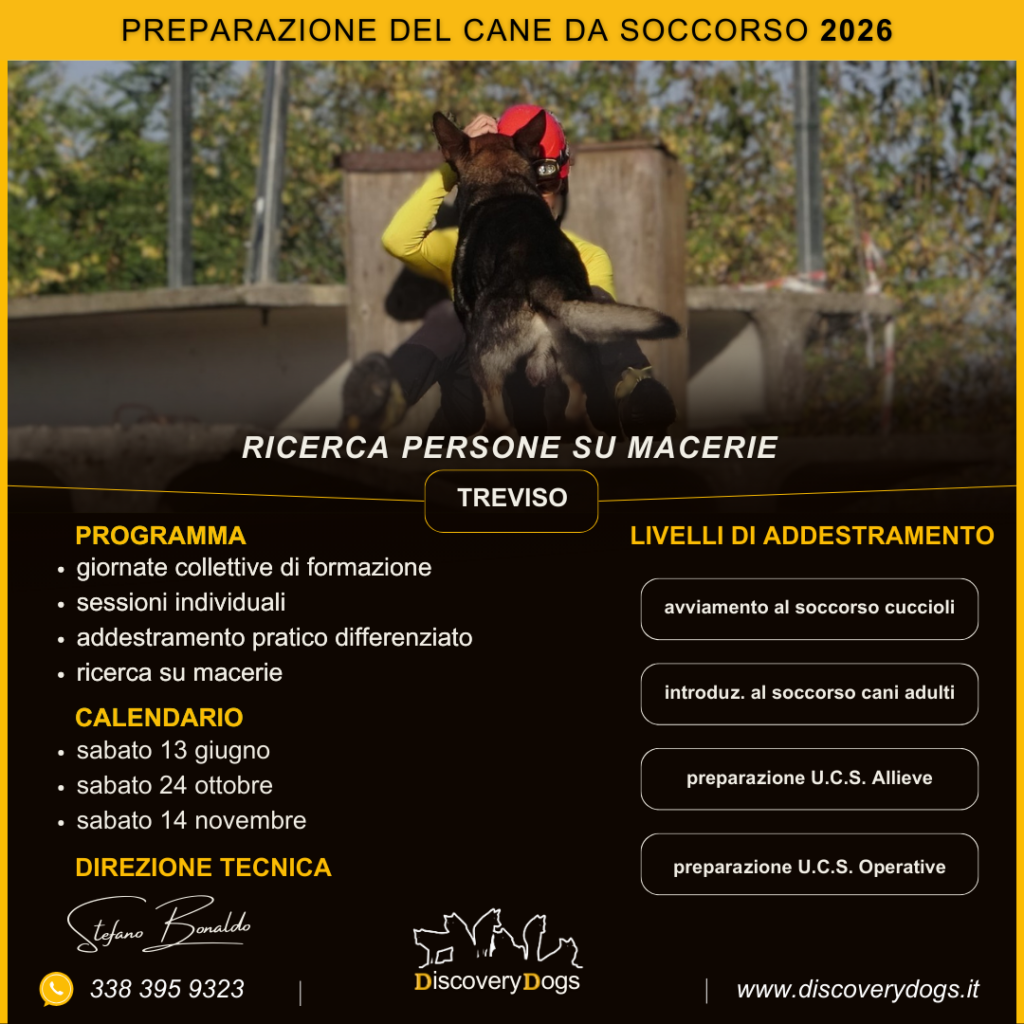 Sarà un percorso formativo specialistico per Unità Cinofile da Soccorso specializzate nella ricerca su macerie. La Formazione prevedrà incontri formativi individuali e di gruppo.