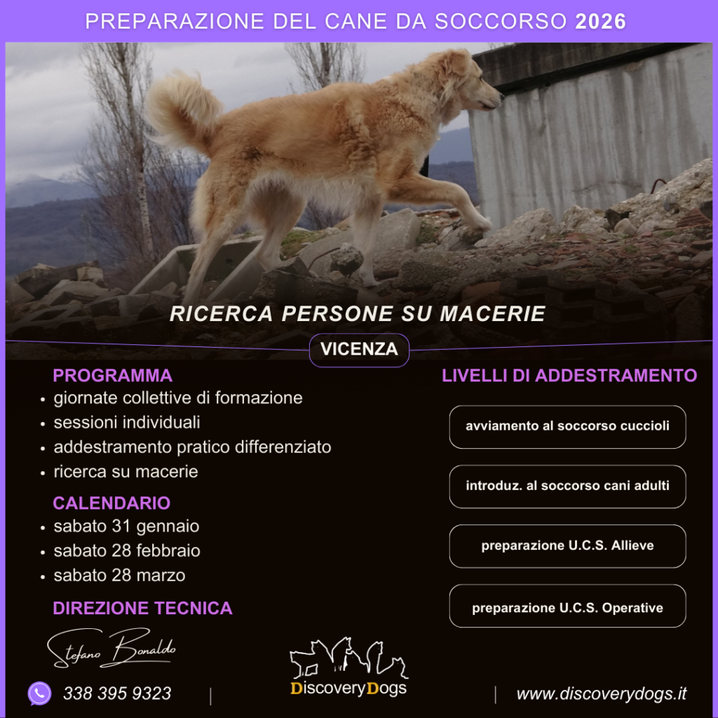 Sarà un percorso formativo specialistico per Unità Cinofile da Soccorso specializzate nella ricerca su macerie. La Formazione prevedrà incontri formativi individuali e di gruppo.